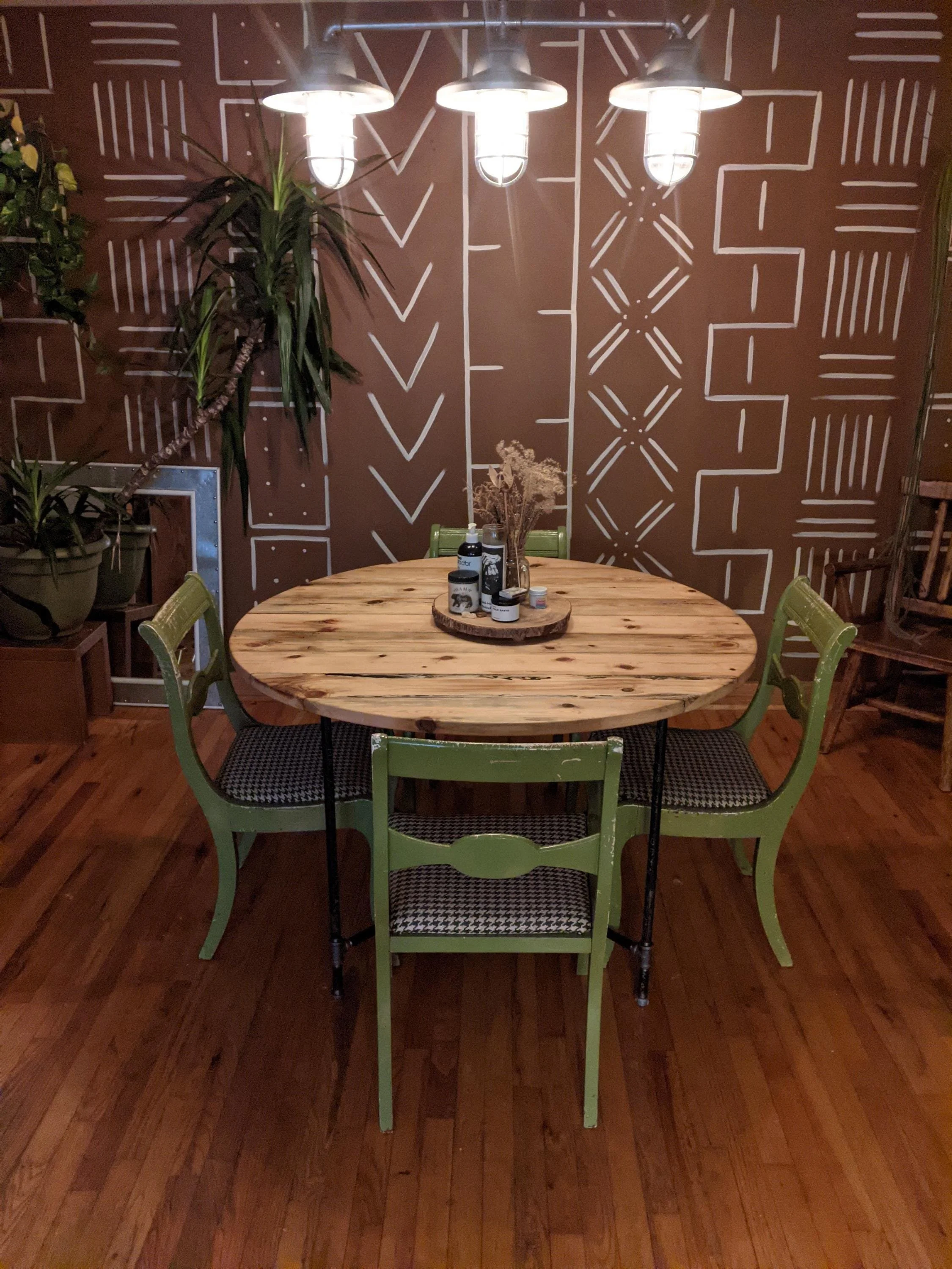 Rustic/Industrial 4’ round breakfast table by Nathan Standridge, crafted in a barn outside of Asheville, NC using aged pine, charcoal grey epoxy resin, and Steeltek structural steel.